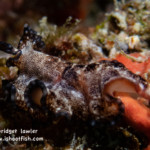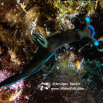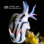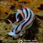 Last up, a nudibranch I found crawling upside down on a wall. This is the Lined Nembrotha (Nembrotha lineolata), about 1.5″ long: