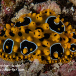 Last up, a nudibranch I found crawling upside down on a wall. This is the Lined Nembrotha (Nembrotha lineolata), about 1.5″ long: