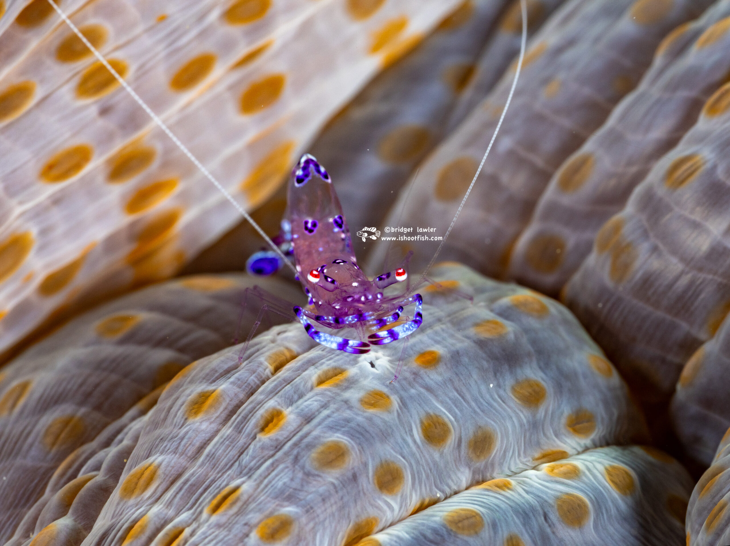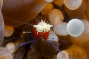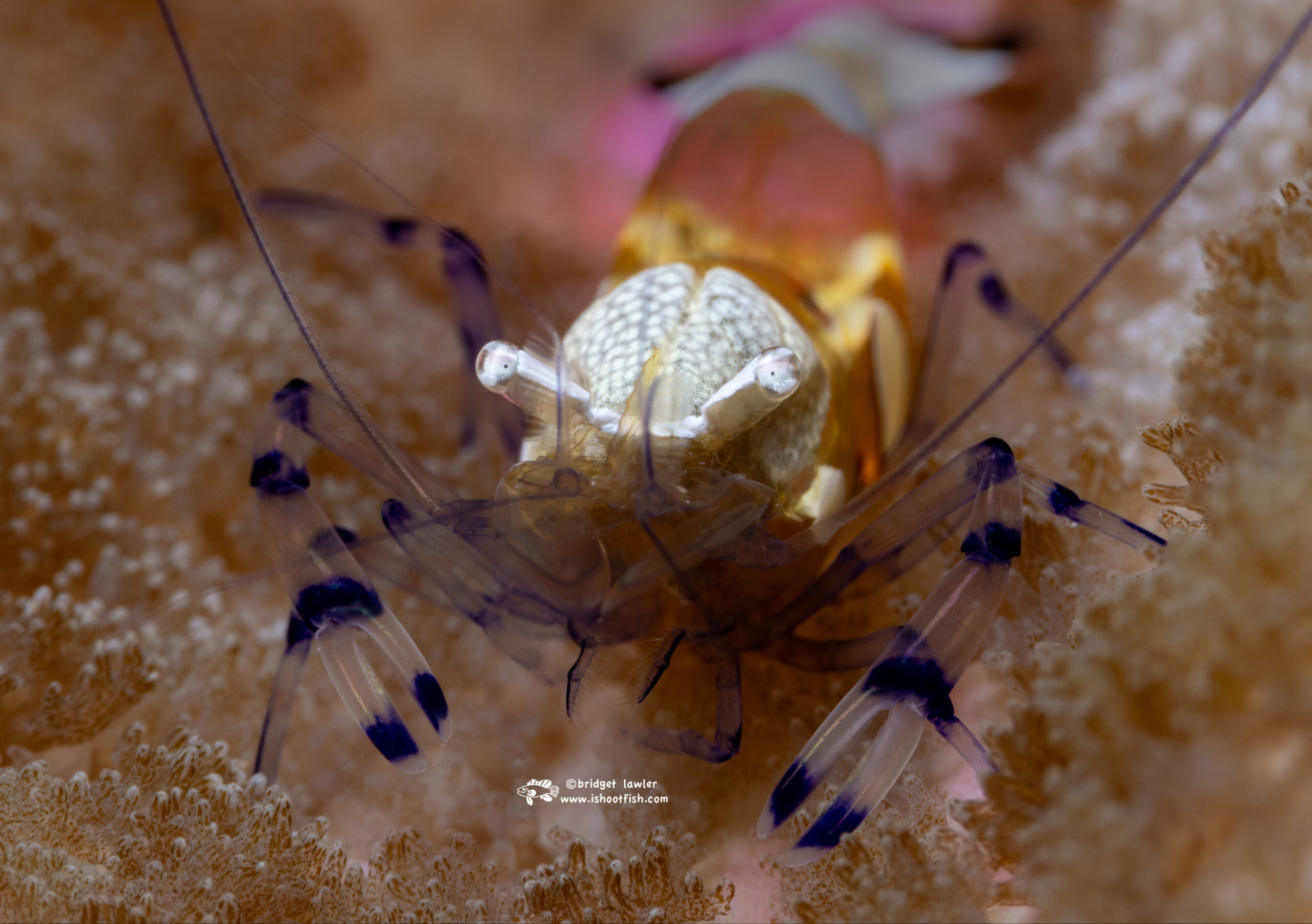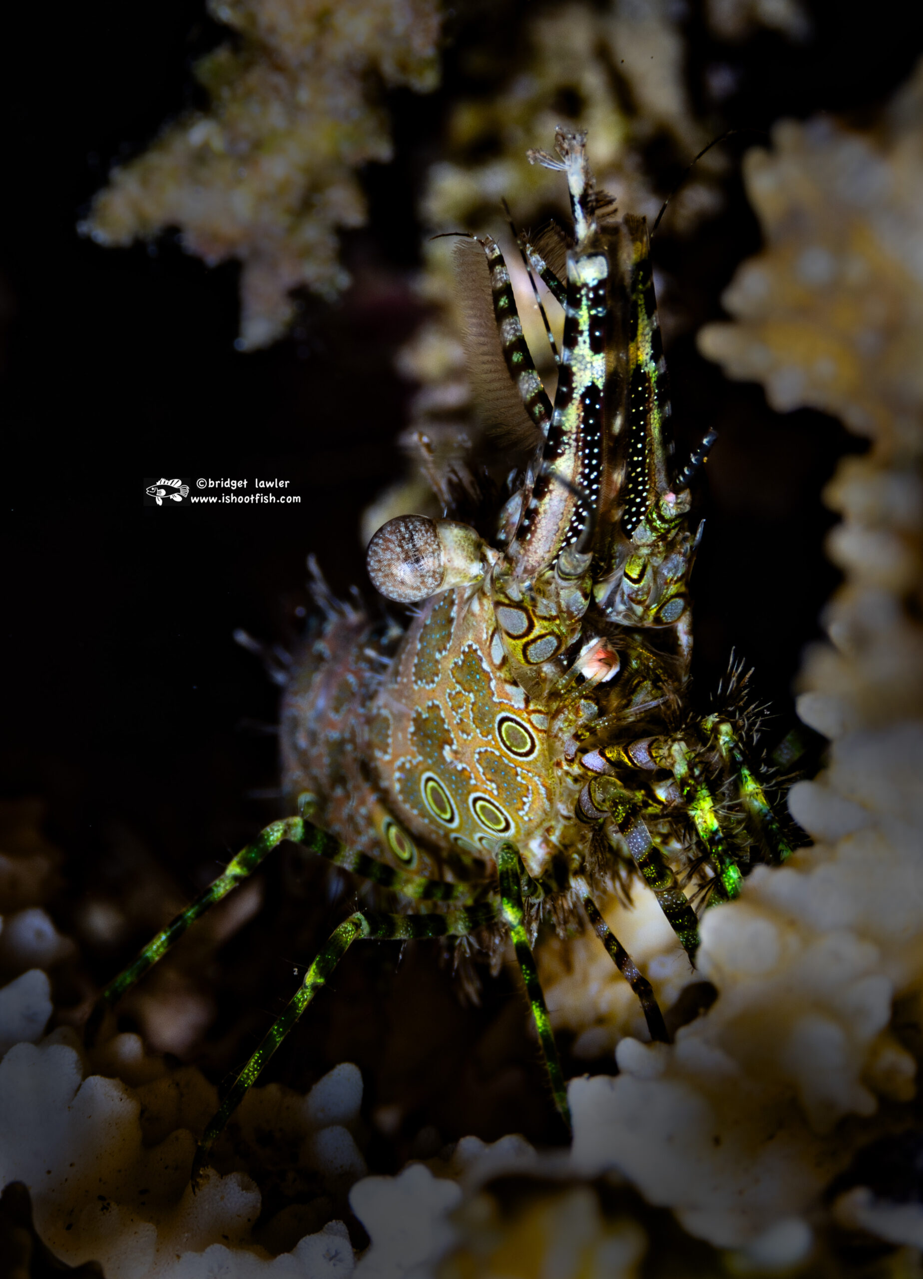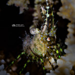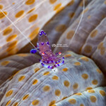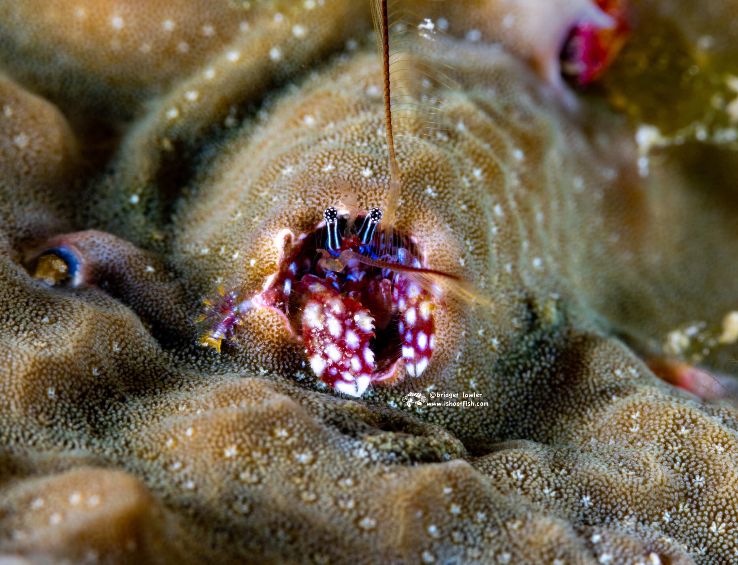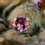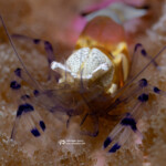 A mushroom coral shrimp, body about 1/4″ across (also known as a popcorn shrimp, scientific name Cuapetes kororensis) was another uncommon find: